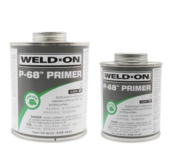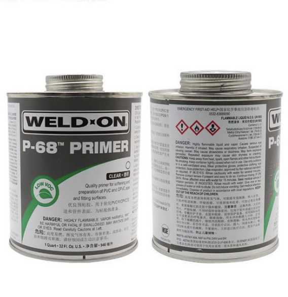 WELD-ON IPSP-68清潔劑 UPVC和CPVC清潔劑(圖5) P-68 IPSP-68清潔劑 UPVC和CPVC清潔劑(圖6)是一種低VOC揮發(fā),無(wú)固含量,快速作用的預粘膠, P-68預粘膠能夠快速軟化和溶解PVC和CPVC和ABS管道和管件的接口表面。使用規格分為透明和紫色,紫色便于在接口表面區別。